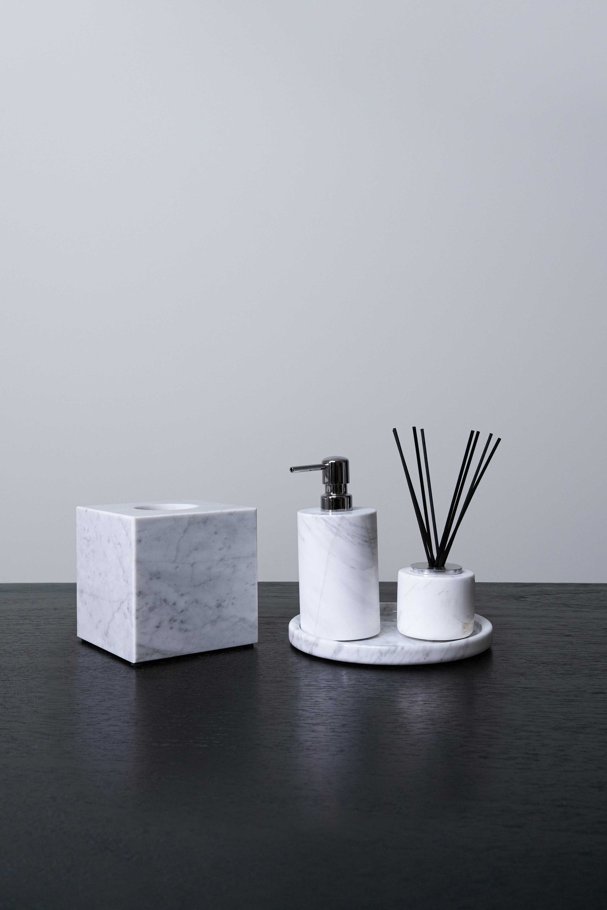 Dispensador de jabón elaborado a mano en mármol Carrara 100% natural, reconocido por su pureza, durabilidad y elegancia atemporal. Su forma rectangular de líneas limpias resalta las vetas únicas e irrepetibles de la piedra, transformando un objeto cotidiano en una pieza de diseño.